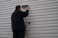 Zurich helps locate the studs... Which there happens to be one right where we need a hole, so Gary frames around it